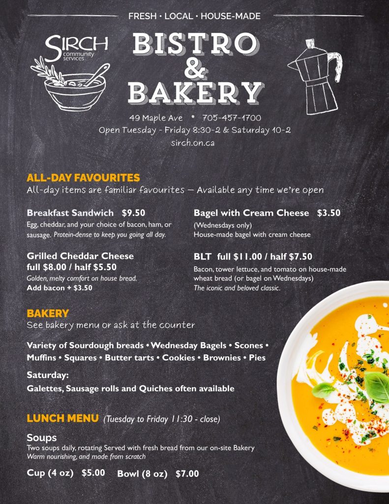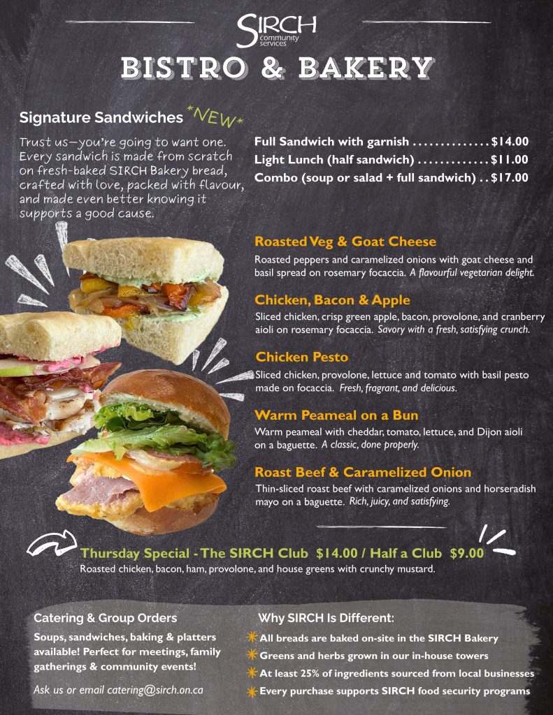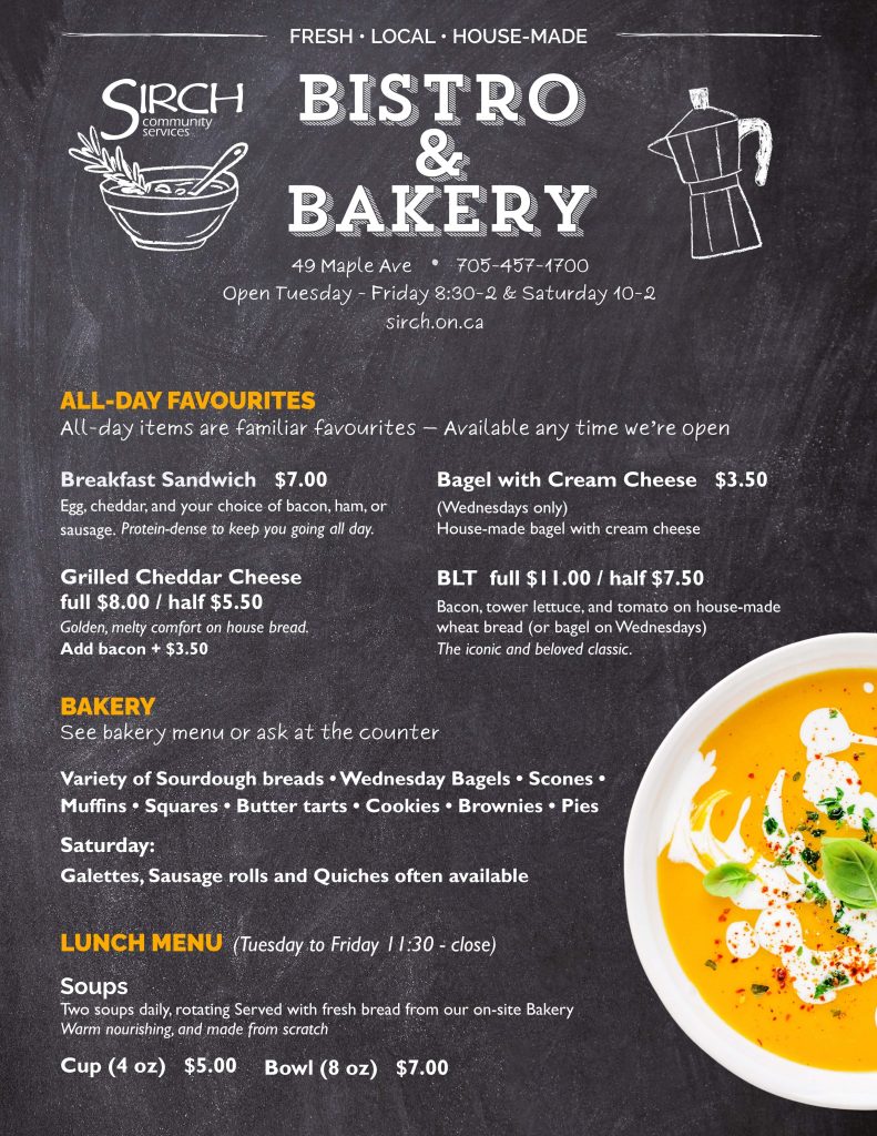 At the SIRCH Bistro & Bakery, we make the kind of food you crave — fresh bread baked on-site, hearty soups, and sandwiches crafted with local ingredients and care. It’s comforting, familiar, and made to nourish.